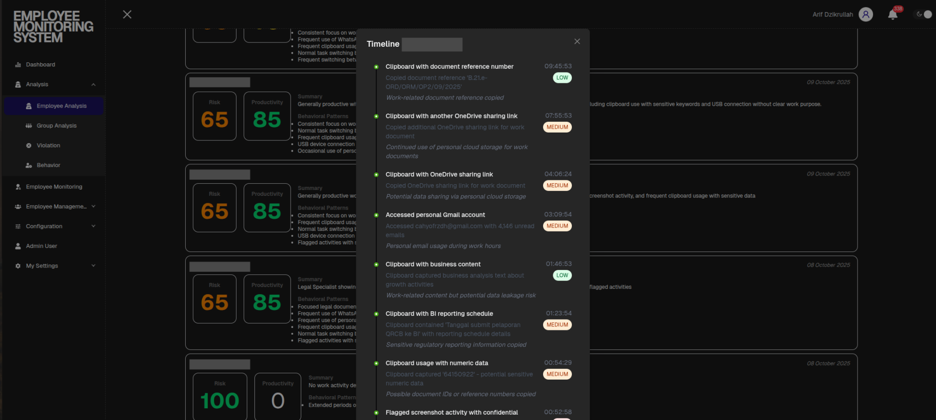 Monitors patterns that may indicate potential threats, helping prevent insider risks, compliance violations, or unsafe practices.