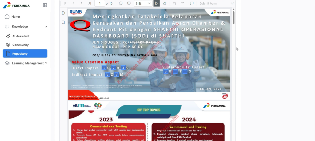 This solution provides an integrated platform for intelligent information access, AI-driven insights, and collaborative learning enabling Pertamina’s workforce to transform knowledge into a strategic asset that drives continuous improvement and operational excellence.