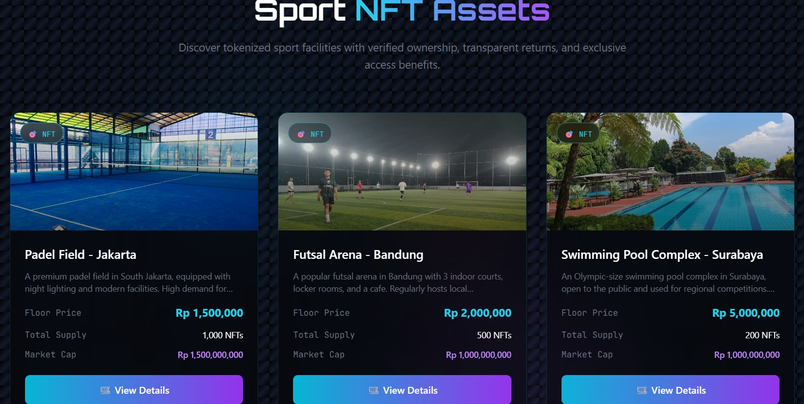 Asset Showcase – Verified real-world sport facilities presented with transparent data, revenue potential, and visuals.